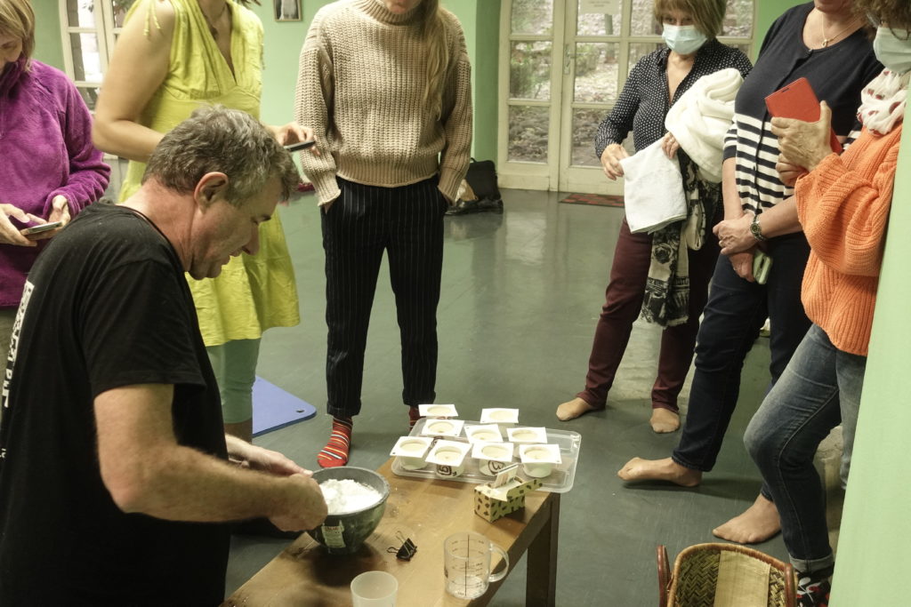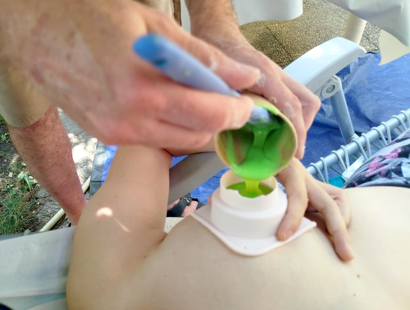- Préparation : Chaque binôme reçoit un kit (moule, alginate, eau, spatule). La personne qui se fait mouler s’allonge et dévoile un sein, tandis que son ou sa partenaire prépare le mélange.